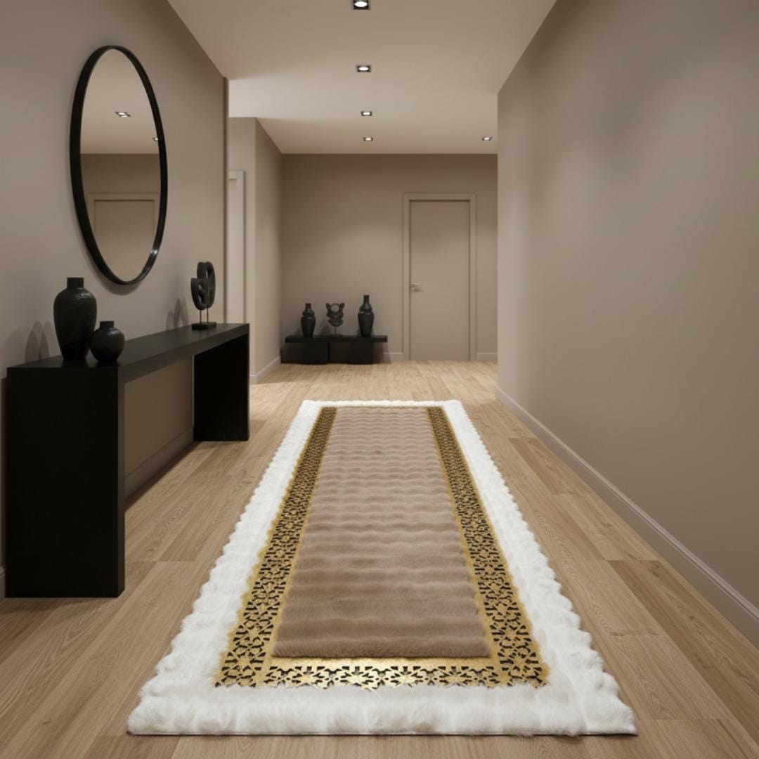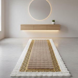 Beyaz Zeminli Açık Kahverengi Camel Merkezli Peluş Halı – Yumuşak Dokulu, Şık ve Dekoratif Halı