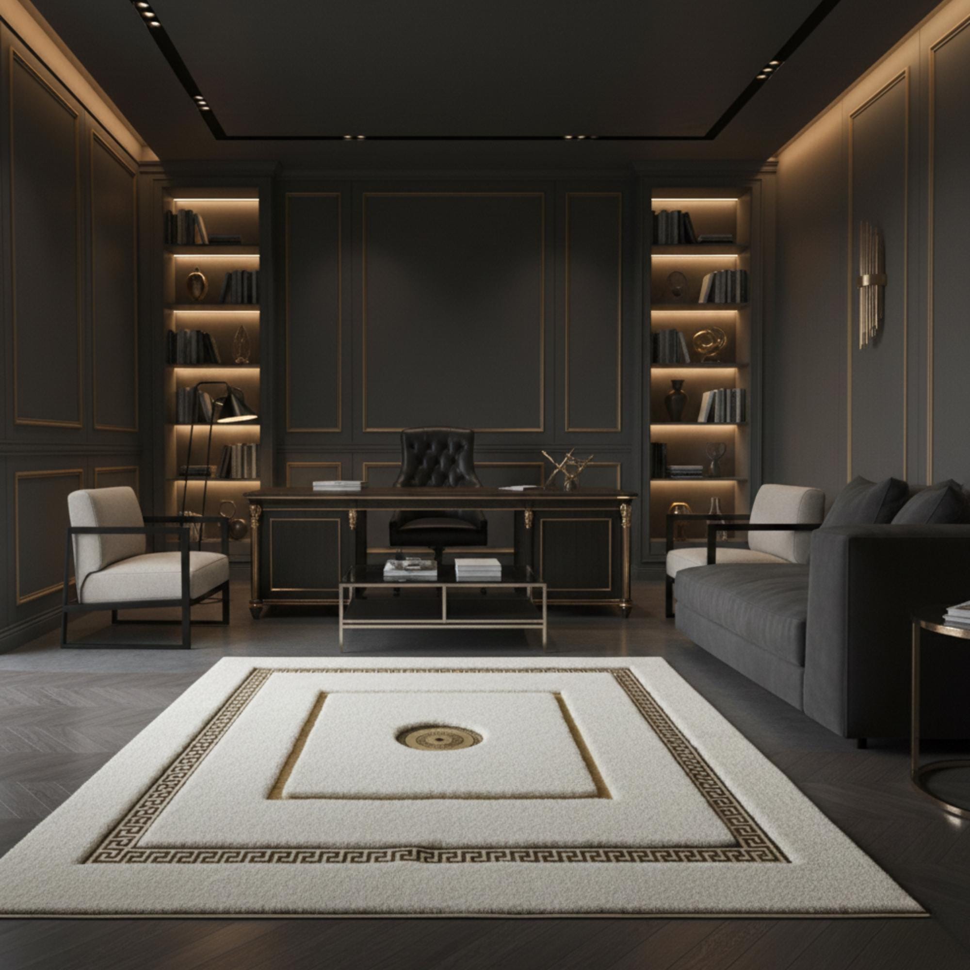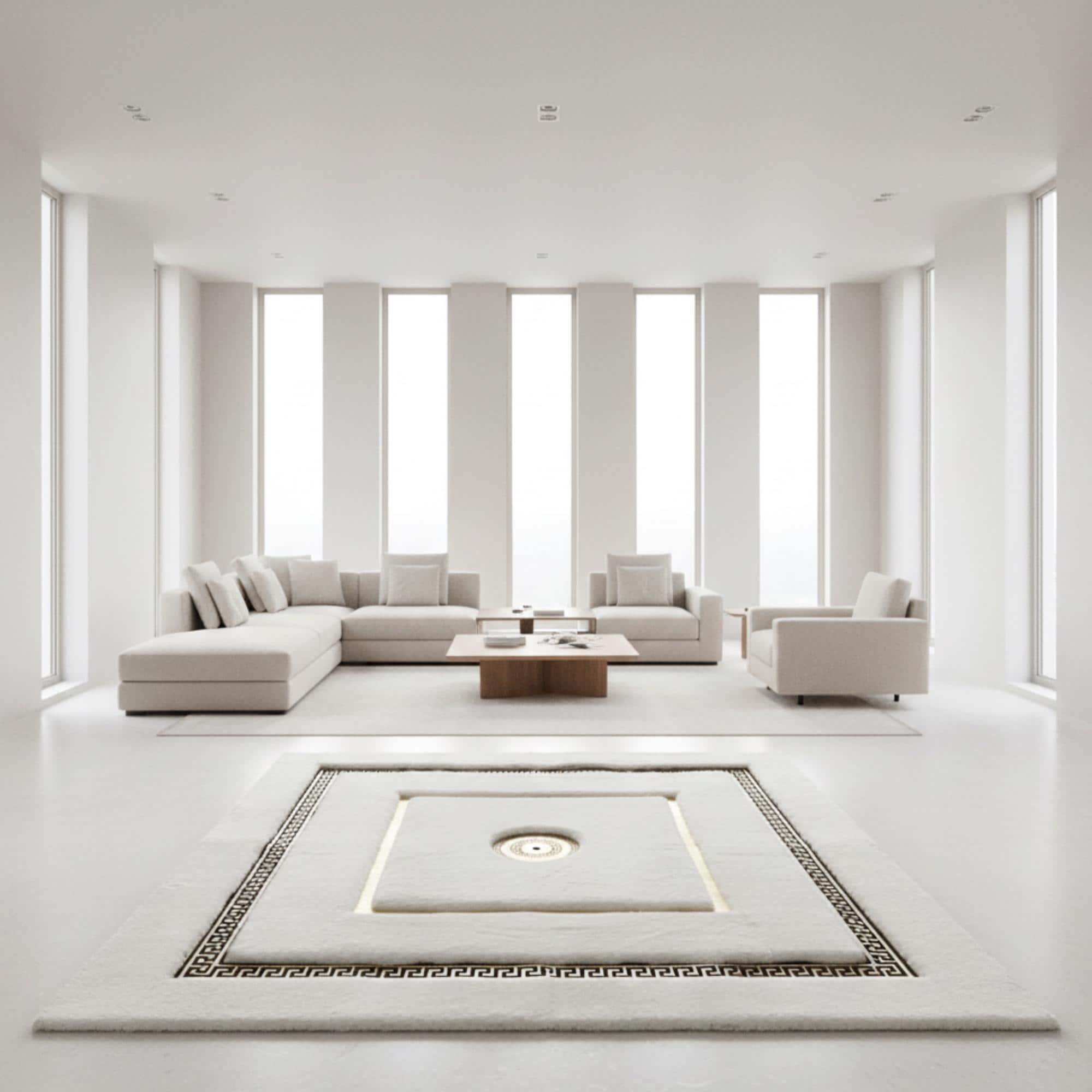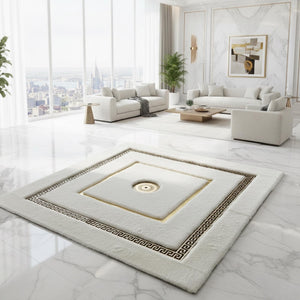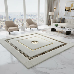Beyaz zemin üzerine merkezde konumlandırılmış altın motif ve çevresini saran klasik altın bordür detaylarıyla tasarlanan bu peluş halı, simetrik yapısı ve dengeli renk uyumuyla mekâna zarif ve sofistike bir görünüm kazandırır. Merkezdeki motif odak noktası oluştururken, çerçeveli bordür tasarımı halının formunu net şekilde vurgular.