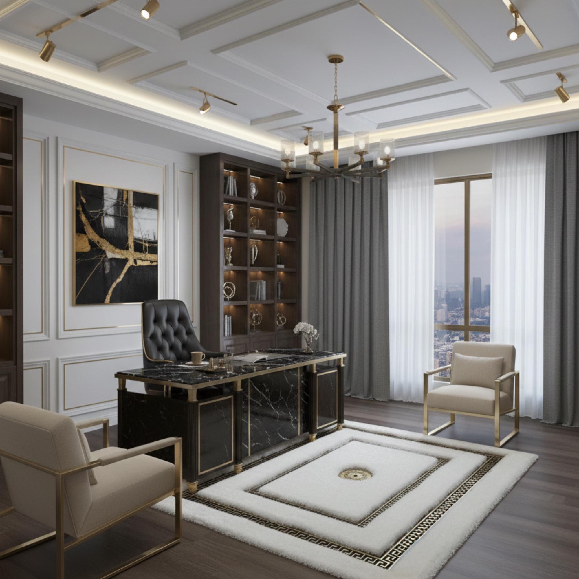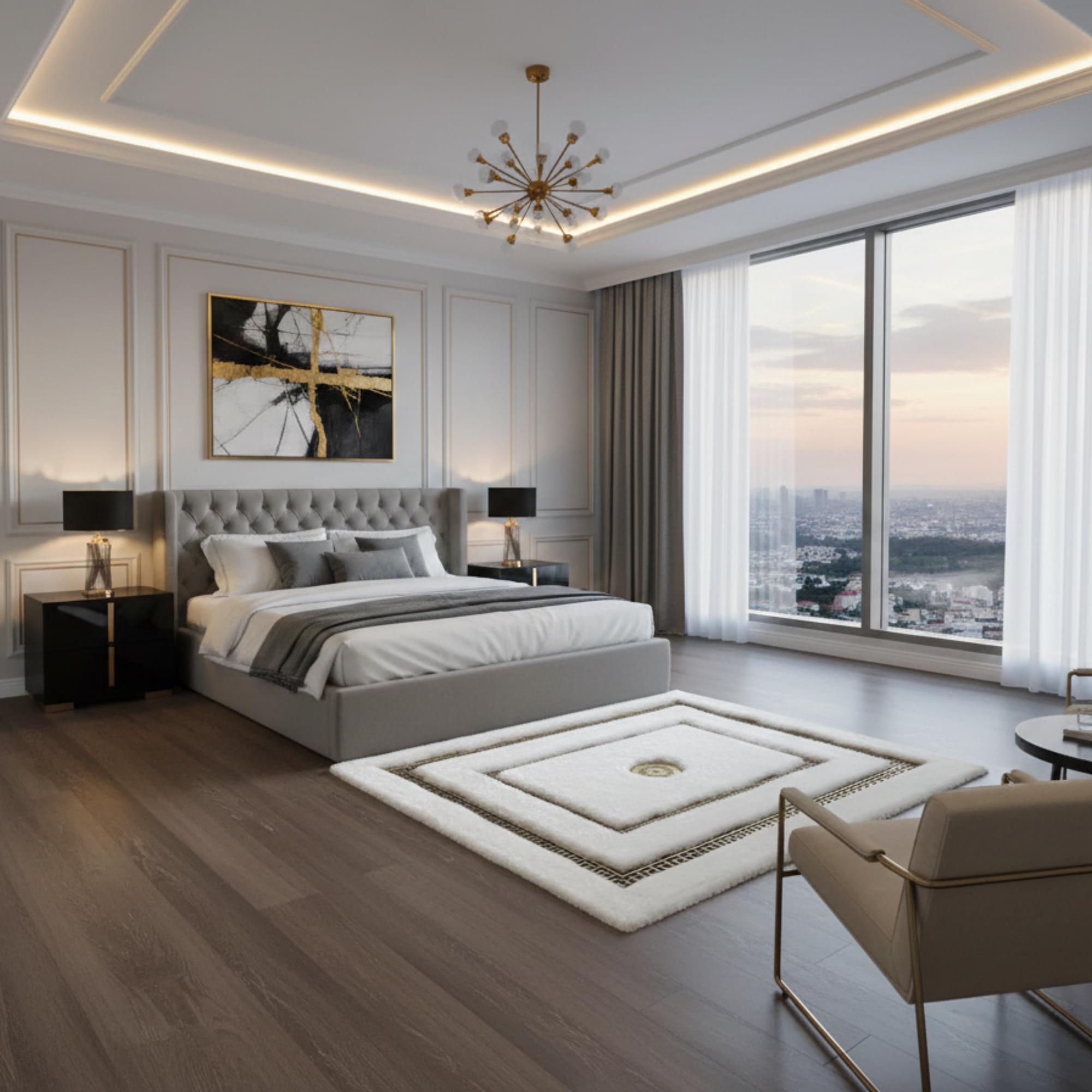 Beyaz zemin üzerine merkezde konumlandırılmış altın motif ve çevresini saran kahverengi zeminli altın çerçeve detaylarıyla tasarlanan bu peluş halı, klasik ve modern çizgiyi dengeli şekilde bir araya getirir. Merkez motif halıya net bir odak noktası kazandırırken, çerçeveli yapı formu belirginleştirir ve mekânda düzenli bir görünüm oluşturur.