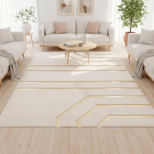 Beyaz Zeminli Altın Geometrik Çizgi Detaylı Peluş Halı – Yumuşak Dokulu