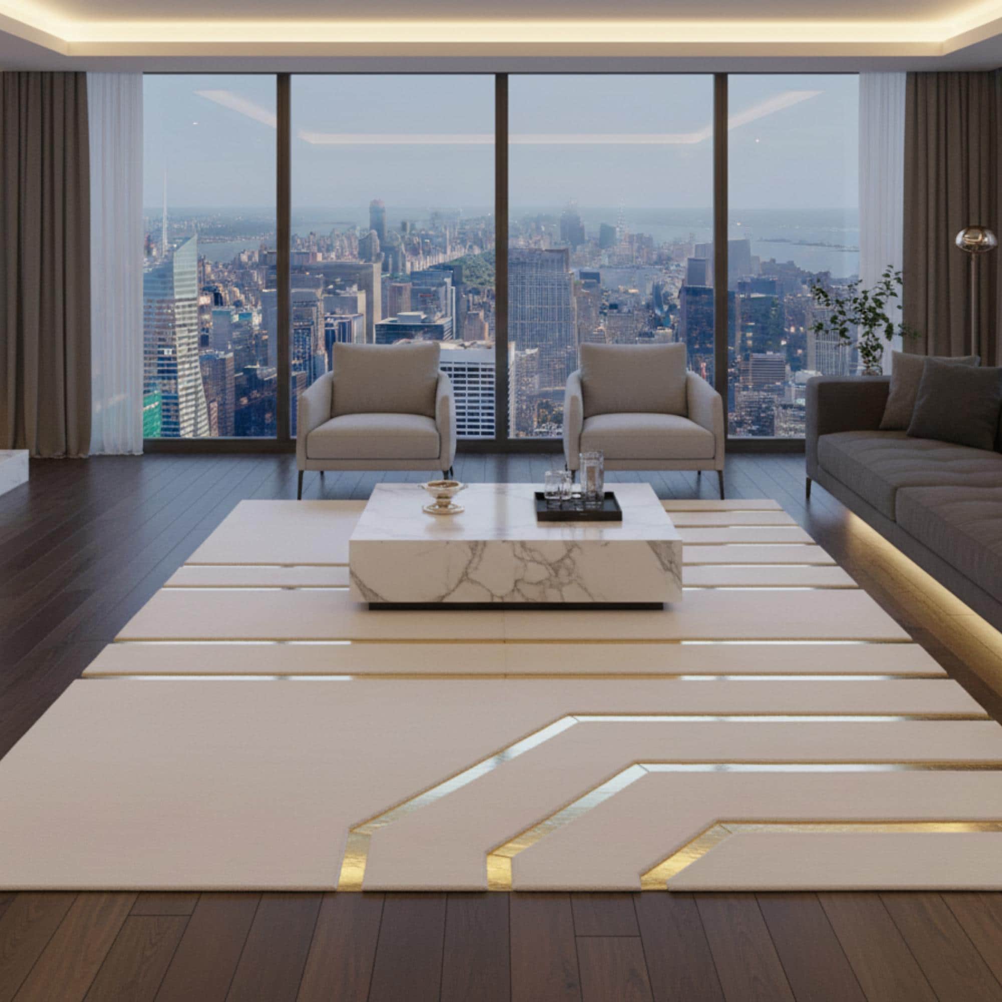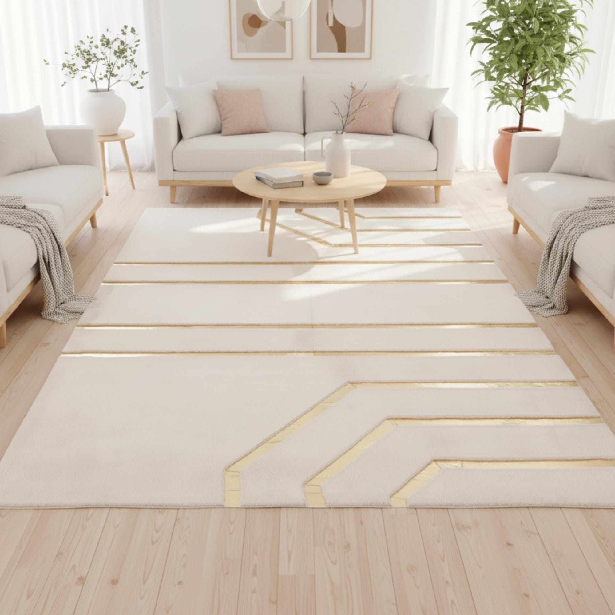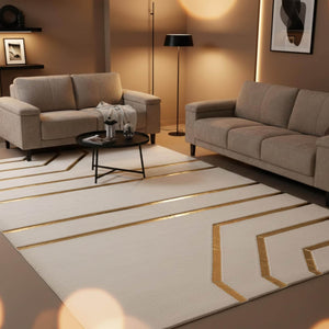 Beyaz zemin üzerine altın geometrik çizgi detaylarıyla tasarlanan bu peluş halı, net hatları ve dengeli desen yapısıyla mekâna modern ve sofistike bir görünüm kazandırır. Asimetrik çizgiler yüzeyde hareket hissi oluştururken, açık renk zemin alanı ferah ve düzenli gösterir.