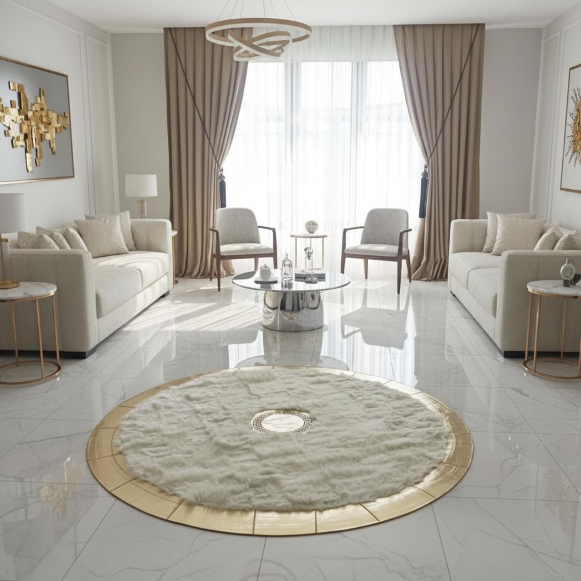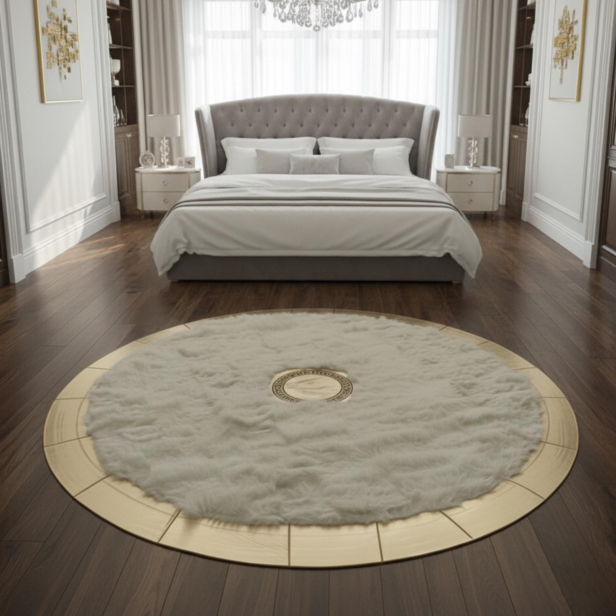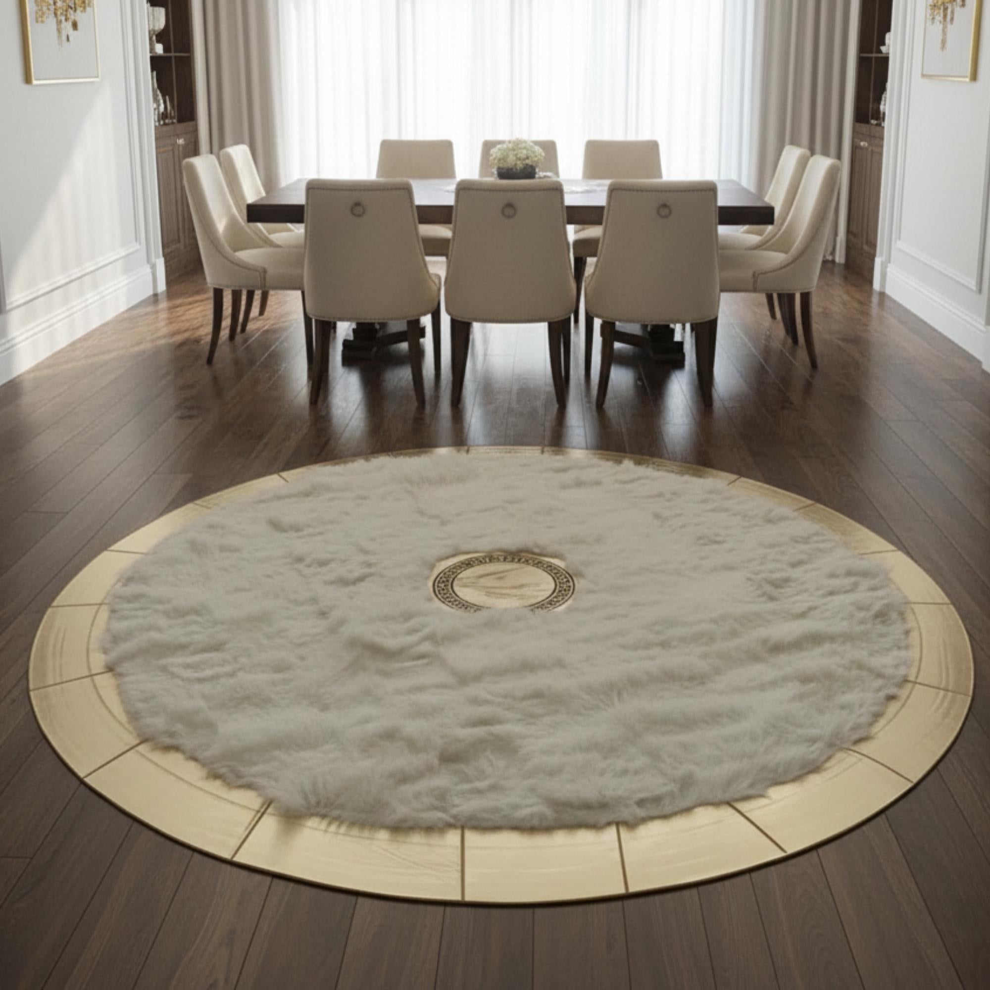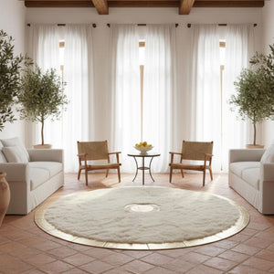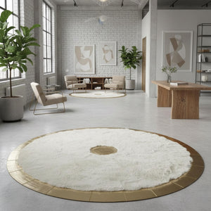 Beyaz Toskana zemin üzerinde merkezde konumlandırılmış altın detay ve çevresini saran altın çerçeve ile tasarlanan bu yuvarlak halı, sade yüzeyi dengeli vurgularla tamamlar. Merkez ve çerçeve detayları halıya net bir form kazandırırken, yüzeyde düzenli ve bütünlüklü bir görünüm oluşturur.