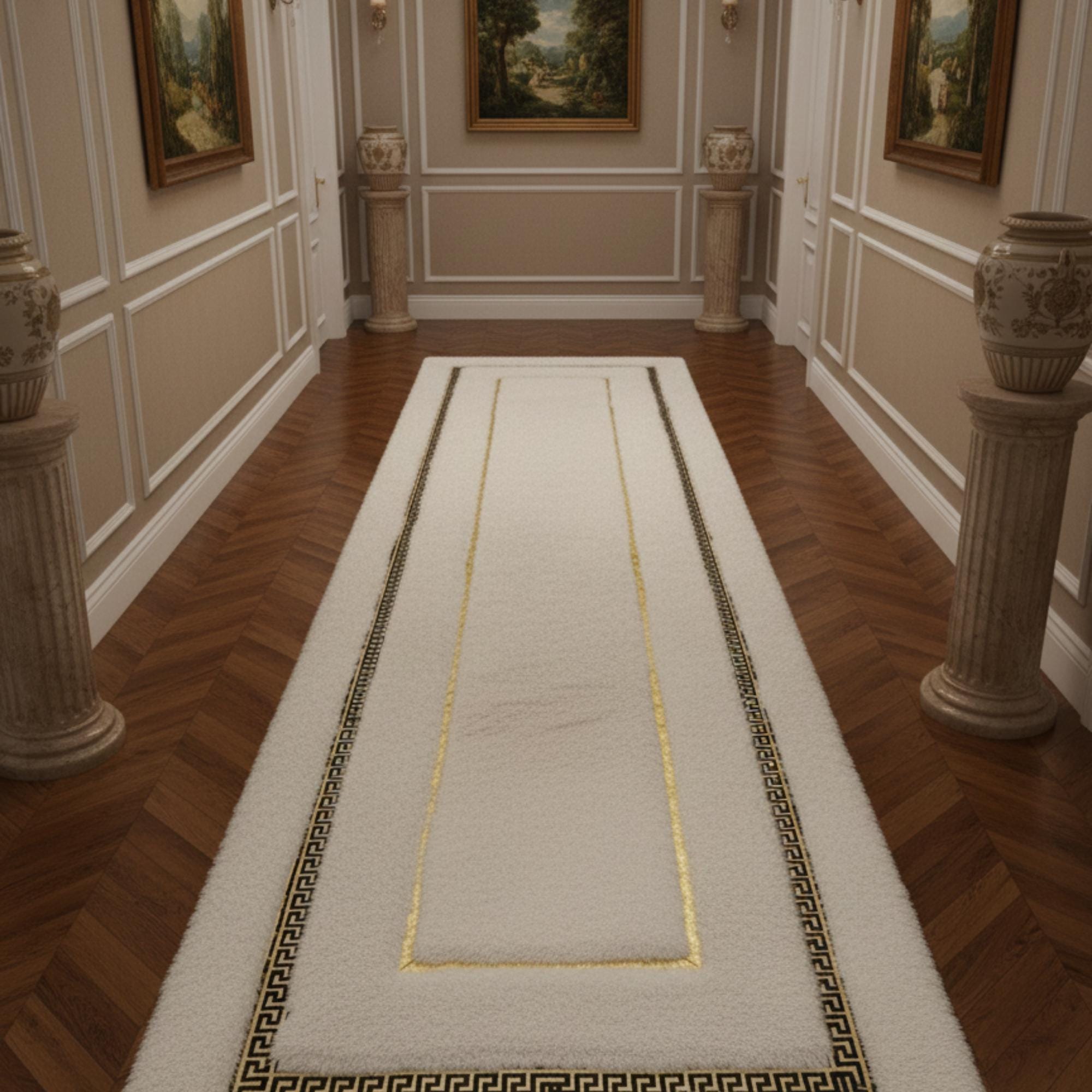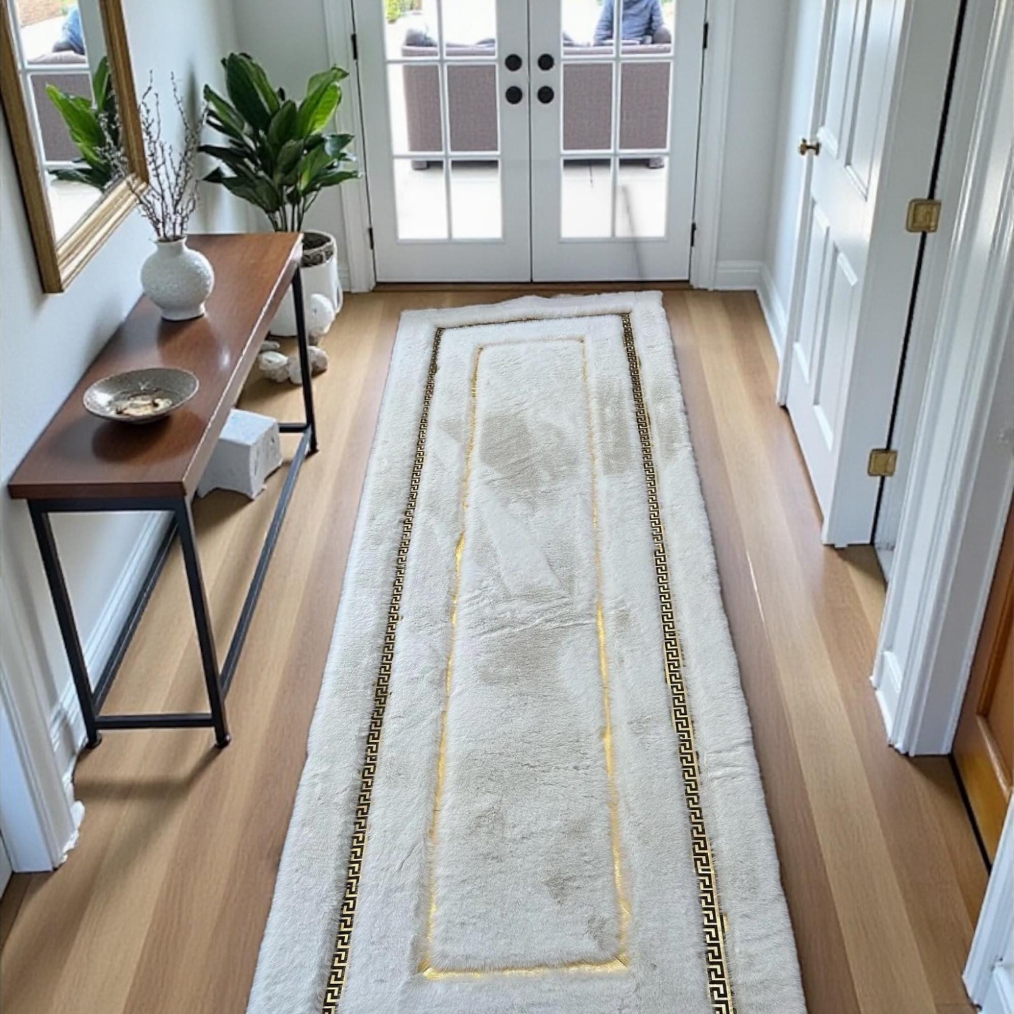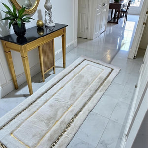 Beyaz zemin üzerine ince altın çerçeve detaylarıyla tasarlanan bu peluş runner halı, sade ve zarif çizgileriyle mekâna ferah ve düzenli bir görünüm kazandırır. İnce bordür yapısı, uzun form boyunca halının sınırlarını netleştirirken açık renk zemin koridor ve geçiş alanlarında aydınlık bir etki oluşturur.