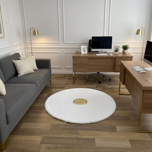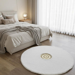 Beyaz Zeminli Merkez Altın Detaylı Yuvarlak Peluş Halı