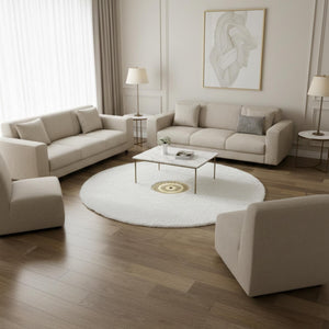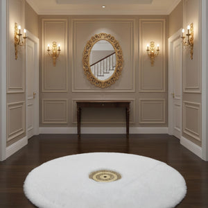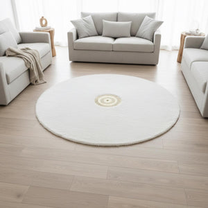 Beyaz peluş zemin üzerinde merkezde konumlandırılmış altın detayla tasarlanan bu yuvarlak halı, sade yüzeyiyle dengeli ve düzenli bir görünüm sunar. Merkez motif yüzeyde net bir odak noktası oluştururken, yuvarlak form halının akıcı duruşunu vurgular.