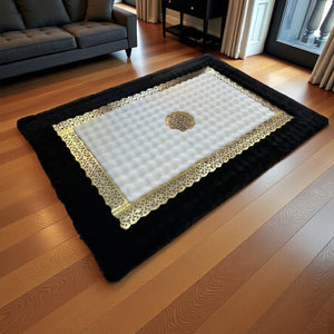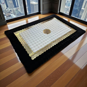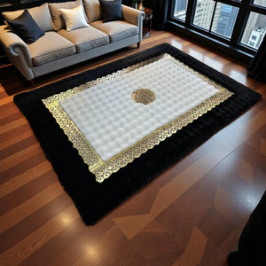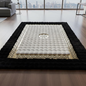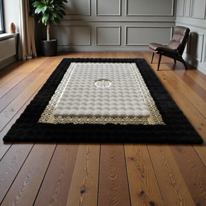 Siyah Zeminli Beyaz Merkezli Altın Motif Bordürlü Peluş Halı