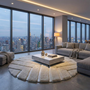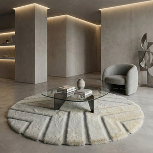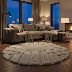 Krem tonlar üzerine geometrik dilimli desenlerle tasarlanan bu yuvarlak peluş halı, yumuşak geçişleri ve dengeli formuyla mekâna modern ve ferah bir görünüm kazandırır. Dairesel yapı, halının bulunduğu alanda akıcı bir etki oluştururken, segmentli desen yüzeye hareket ve derinlik katar.