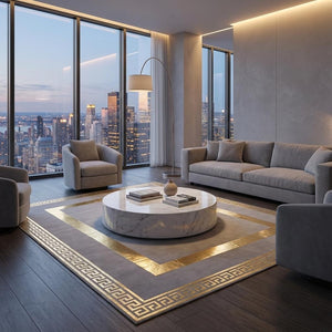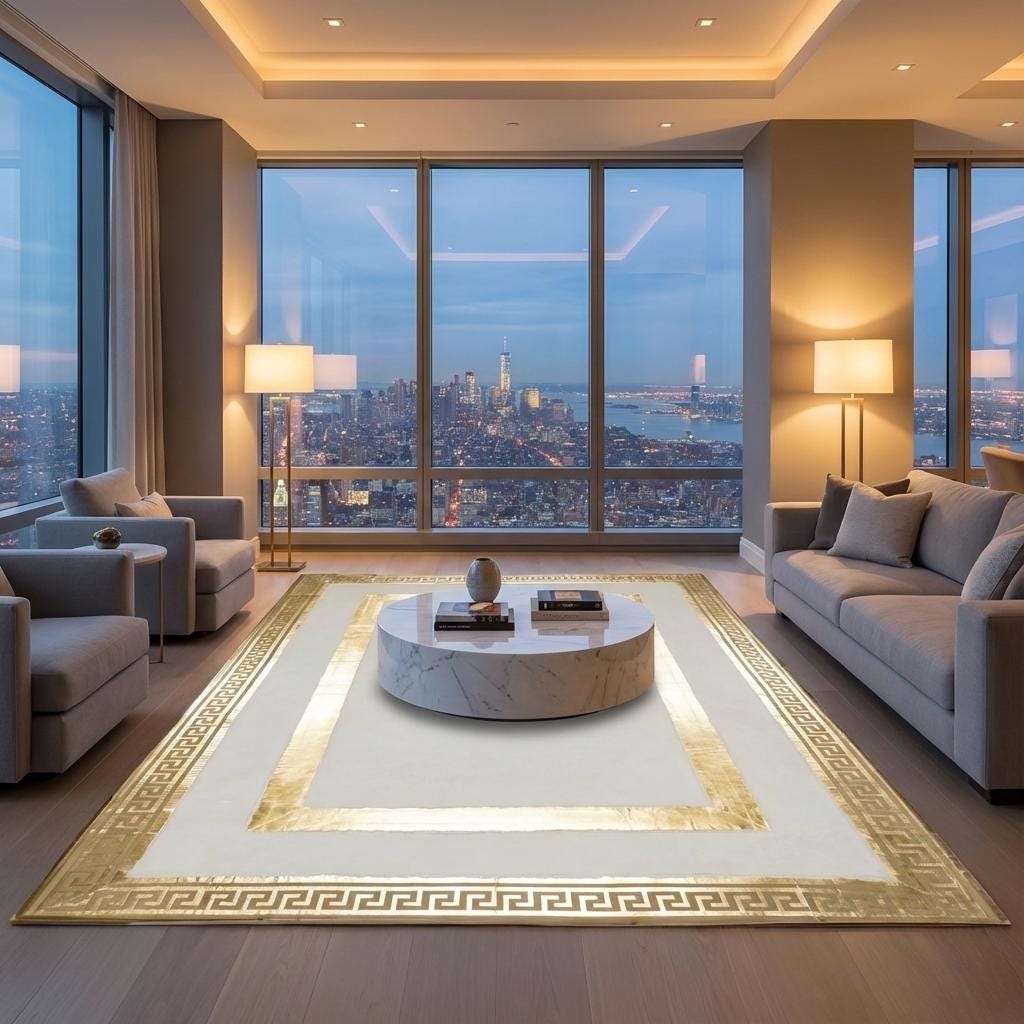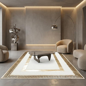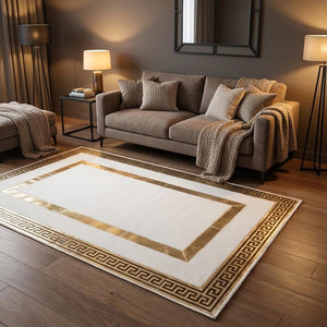 Beyaz Zeminli Altın Bordür Detaylı Peluş Halı – Yumuşak Dokulu,